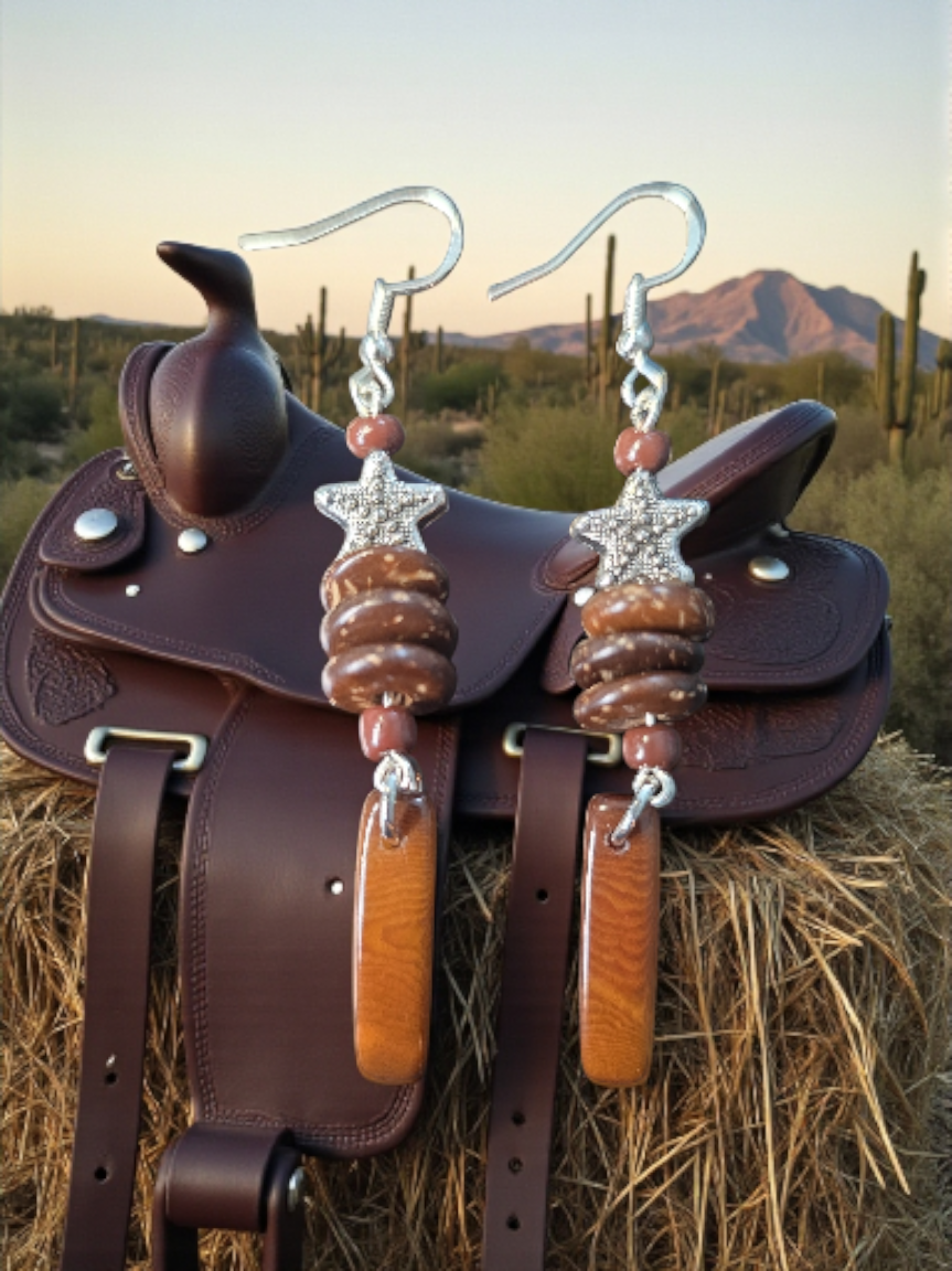 Polished tagua nut baguette drop earrings with a bit of country flair star beads! Other natural wood beads make these cute earrings your go-to pair to wear with your favorite cowboy hat and boots!