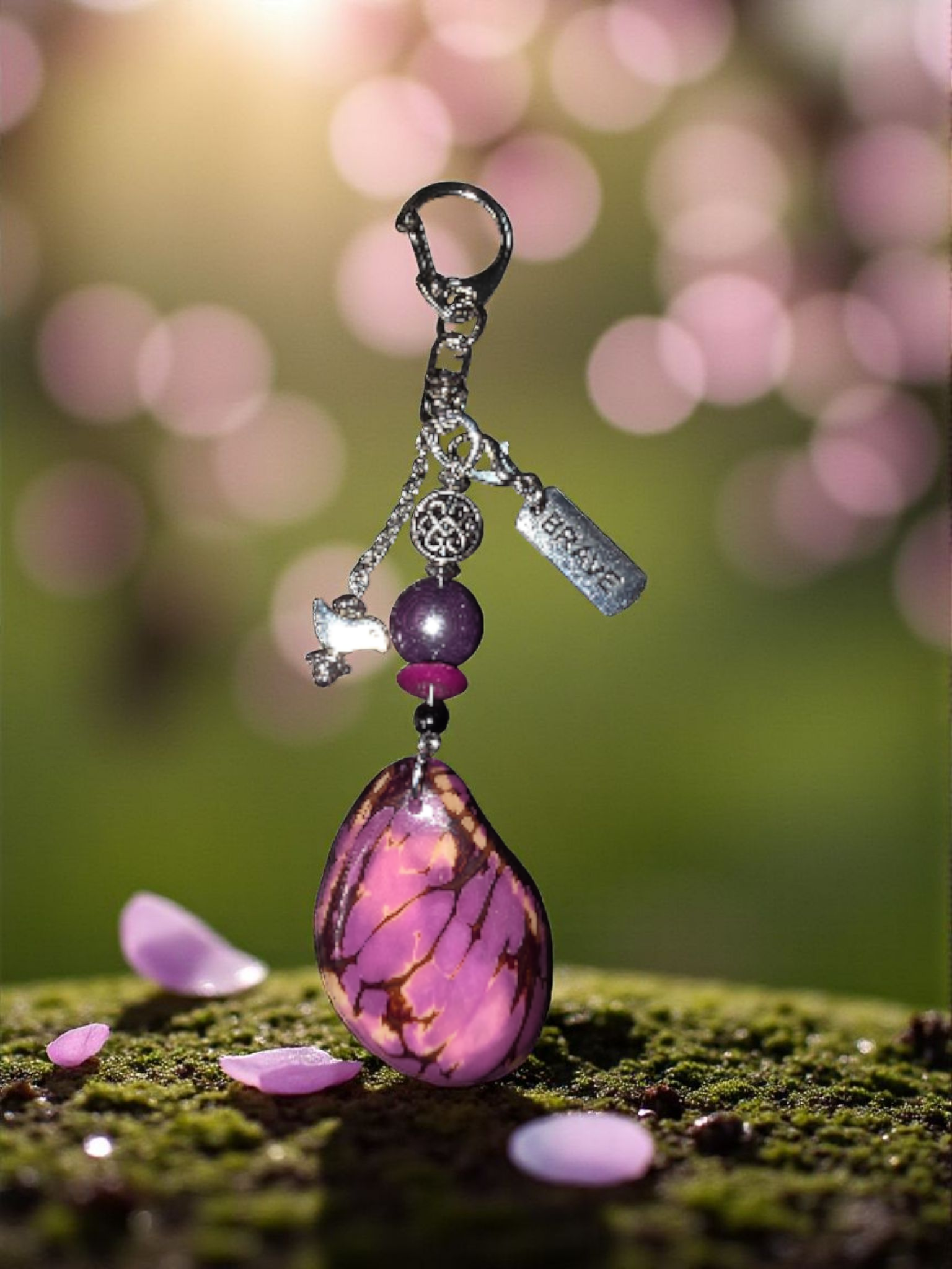 BRAVE : Purple Natural Carved Tagua Bag Charm or Keychain with Brave Charm, Bird and Amulet Bead