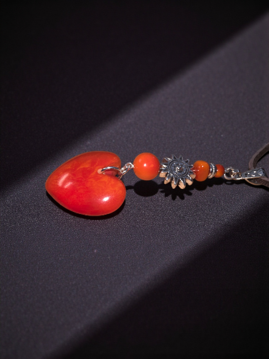 Flame Orange Carved Heart Meets the Sun Amulet Pendant Necklace Vegan from the Rainforest