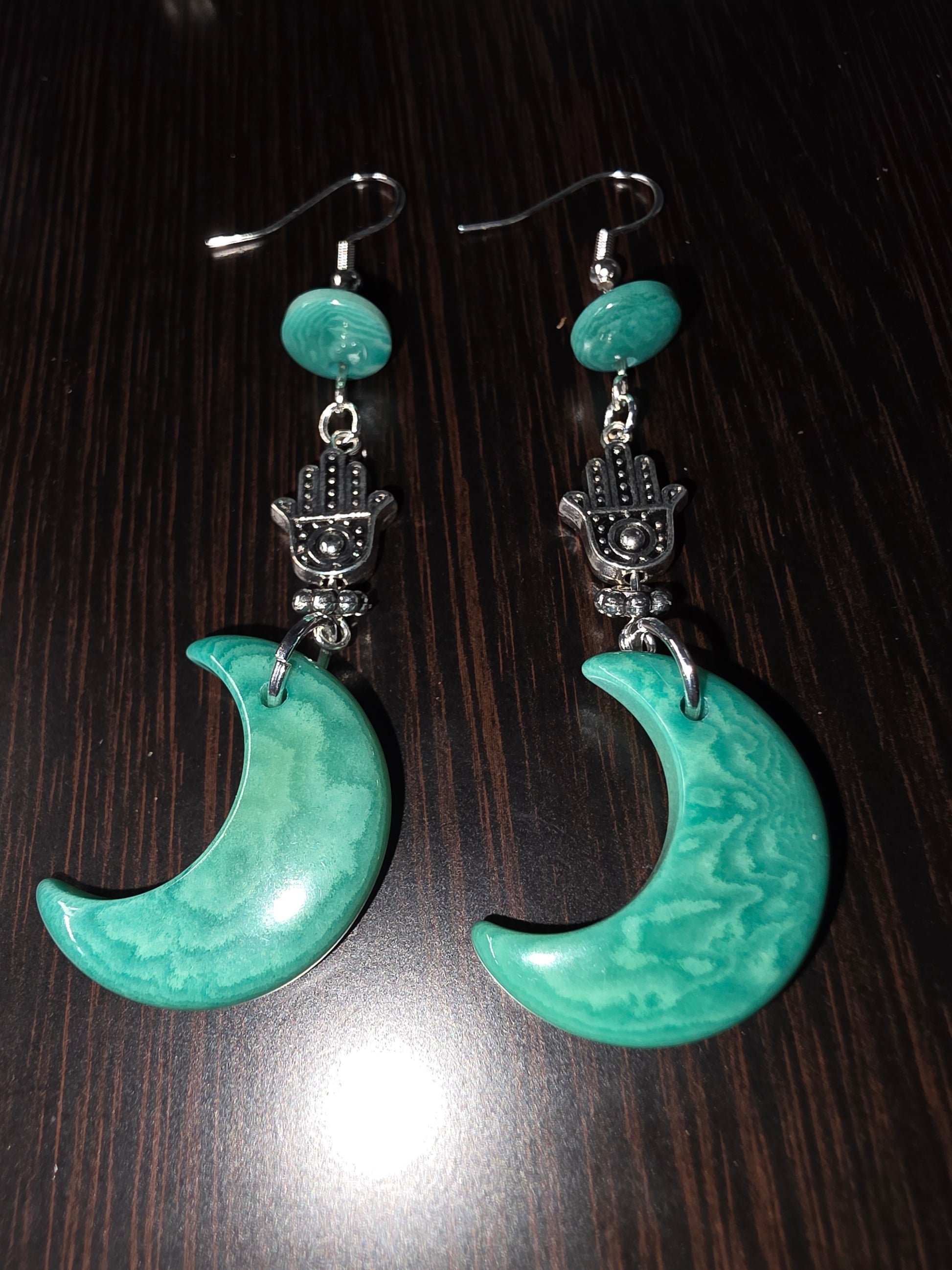 Green Moon Carved Tagua Nut Earrings with Hamsa Beads