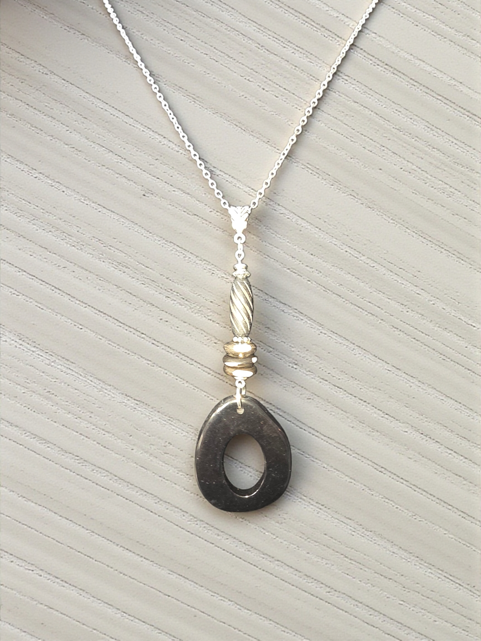 Stunning Polished Tagua Donut Pendant Necklace with Silver Tone and Natural Accents. Picture does not do this justice. It's a polished piece of beauty, lightweight, handmade and easy to wear with everything!